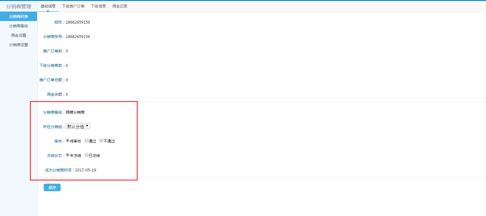 查看分銷商訂單數、下級數量,管理分銷商所在分組、審核情況、凍結狀態等